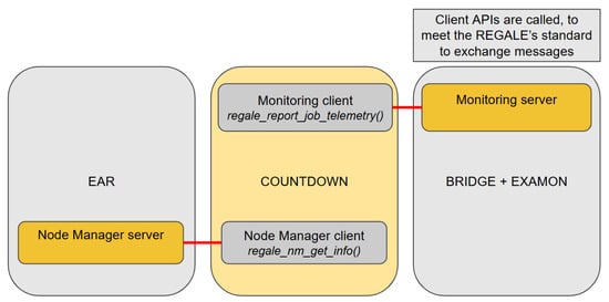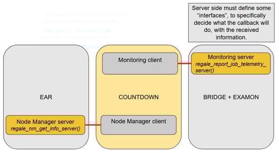 The callback defined by the entities on the server side (EAR and EXAMON) can be triggered by the client (COUNTDOWN) using the REGALE Library API.