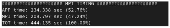 Total time of the run and its specific percentage into MPI phases and into APP phases (not MPI ones).