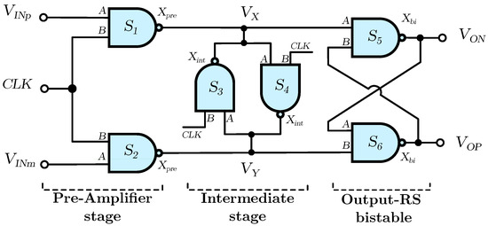 The gate-level structure of the NAND2 is reported in Figure 1 [22]. The architecture is multistage and is made up by 2-input NAND gates only. It is possible to recognize the first stage, also referred to as the pre-amplifier stage, with the analog input signals and , connected to the A inputs of the gates , and the clock signal, , connected to their B inputs. The pre-amplifier cell’s strength is referred to as .