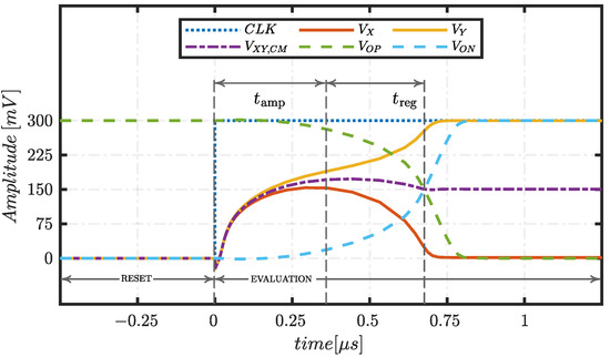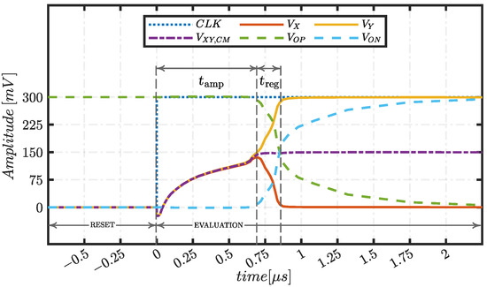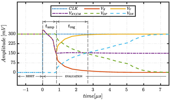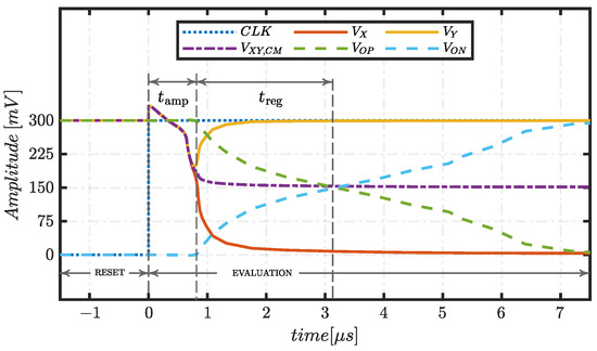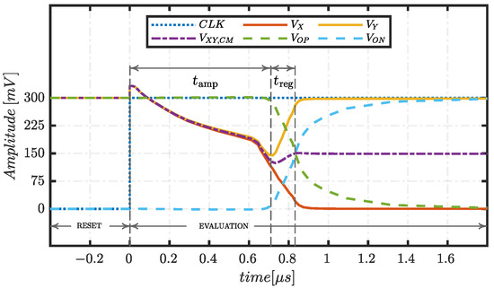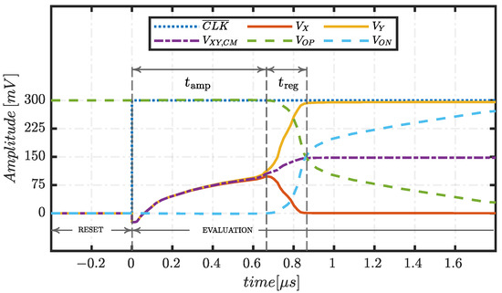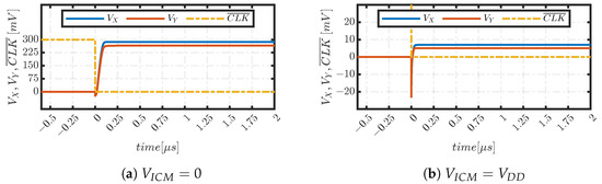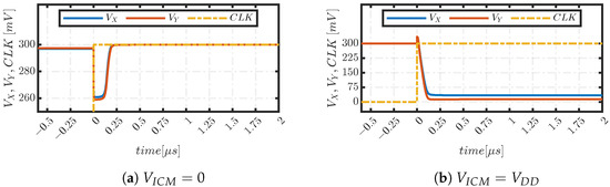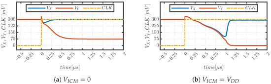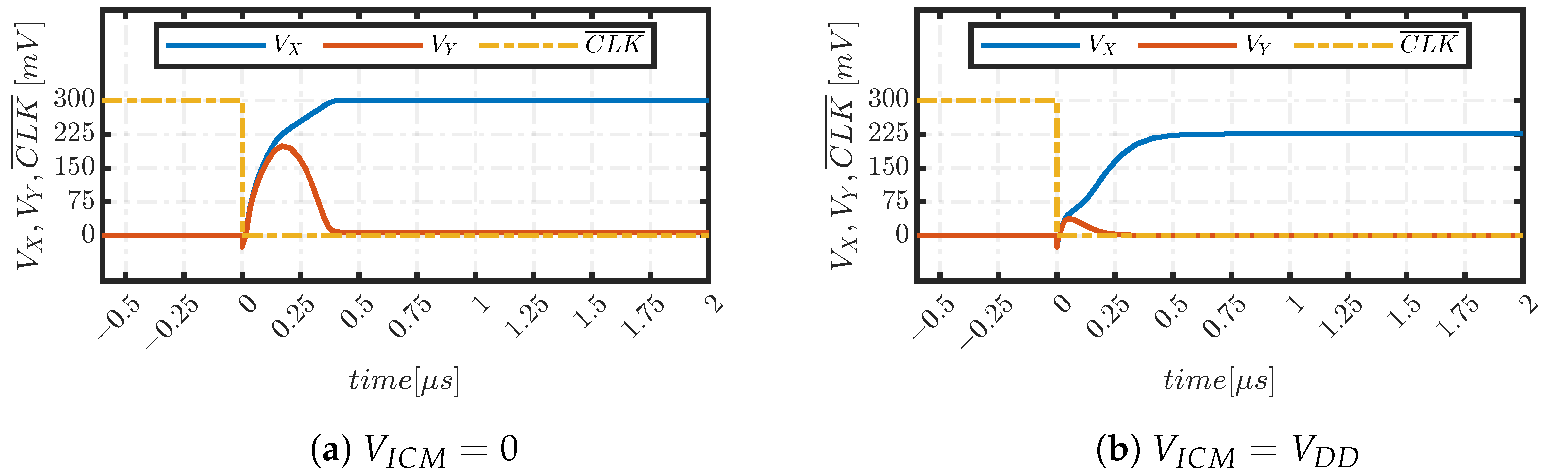 In Figure 12a and Figure 12b are reported the waveforms of and , with equal to 0 and , respectively, in the case when the rail-to-rail ICMR condition is satisfied. As can be seen, after the evaluation phase starts, there is a time, , in which both and rise together with a small difference, , and then a time interval, , in which this small difference is regenerated by the intermediate stage, as introduced in Section 2.