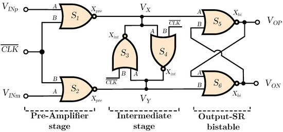 The gate-level structure of the proposed NOR2 topology is reported in Figure 5. It exhibits a multistage architecture and is made up of 2-input NOR gates only. It is again possible to recognize the first pre-amplifier stage, with the analog input signals and , connected to the A inputs of the gates , and the inverted clock signal, , connected to their B inputs. The pre-amplifier outputs, and , are connected to the intermediate stage, consisting of two back-to-back NOR gates, . The output of is fed back to the A input of , and vice-versa, to realize a positive, or regenerative, feedback loop. The remaining B inputs of each gate are connected to the inverted clock signal. The intermediate nodes directly drive the well-known “SR bi-stable” stage, whose function is to sample and retain, at the output nodes, and , the information extracted from the analog input differential signal, , amplified by the first stage and regenerated by the intermediate stage, as in the NAND2. The strength of the pre-amplifier stage, intermediate stage and the output bi-stable stage cells are indicated as , and , respectively.