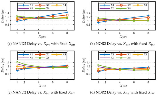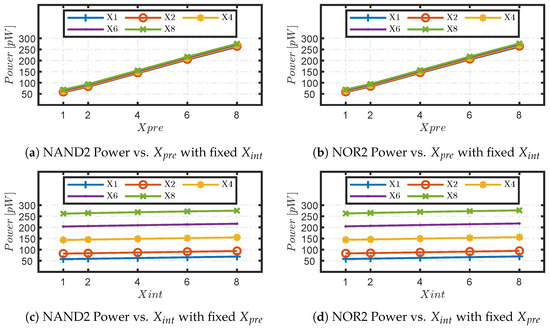 Simulation results are shown in Figure 10a and Figure 10b for the NAND2 and NOR2, respectively. Figure 10a, where is varied for a fixed , confirms the above discussed increase in power consumption versus . On the other hand, when is varied for a fixed , the increase in power consumption is negligible, as shown in Figure 10c and Figure 10d for the NAND2 and NOR2, respectively, thus confirming the expected impact on power consumption of the pre-amplifier strength versus the intermediate stage strength.