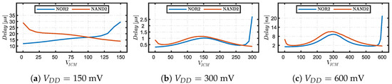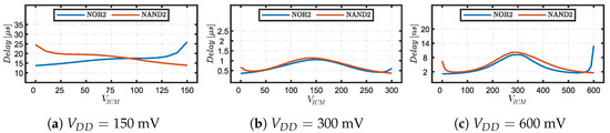 As can be seen from Table 5, the NOR2 designed for minimum offset shows a much lower delay, with higher power consumption; nevertheless, the PDP is greatly reduced with respect to [19,20]. From the offset point of view, the NOR2 exhibits a slightly higher and a much lower , at 150 mV. The becomes higher as the supply increases, with respect to the values of [19,20], which are almost constant. In fact, the of the NOR2 is higher than [19,20], unless at 150 mV supply, and increases with supply voltage. However, if the is considered, the NOR2 offers the best trade-off between offset, power consumption and delay, at 150 mV.