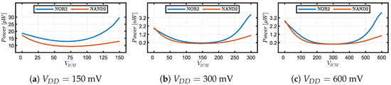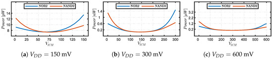 As can be seen, with a hardly scaled supply voltage of 150 mV and 300 mV, the NOR2 exhibits a equal to mV and mV, respectively. These values are about 5 mV less than the of the NAND2. However, this difference is payed with an increased power consumption. The same holds at 600 mV, where the NOR2 offers a 10 mV smaller . It is worth noting that the of each topology increases with the supply voltage, but the ratio is always lower than .