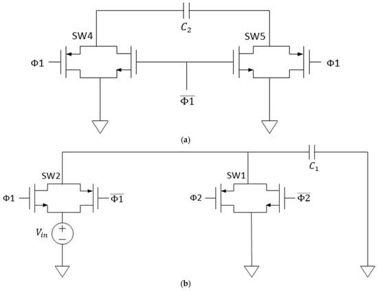 Figure 2 illustrates the implementation of the resistor emulator circuit at the input sampling stage and the feedback stage, respectively. The resistor emulator circuit at the input sampling stage consists of ‘SW1’, ‘SW2’, and . The ON resistance of the designed switch is 10 mΩ. The value of the in the resistor emulator circuit is chosen based on the charge transfer rate, which is the switching frequency () of the resistor emulator circuit [40]. The of the resistor emulator is set to 1 MHz. Based on the and the value of , a charge () stored in the is given by Equation (3). The charge transfer occurs at , and the rate of charge transfer per unit time () is given by Equation (4). Thus, an equivalent of the resistor emulator circuit in Figure 2a can be described as Equation (5), using Equations (3) and (4).