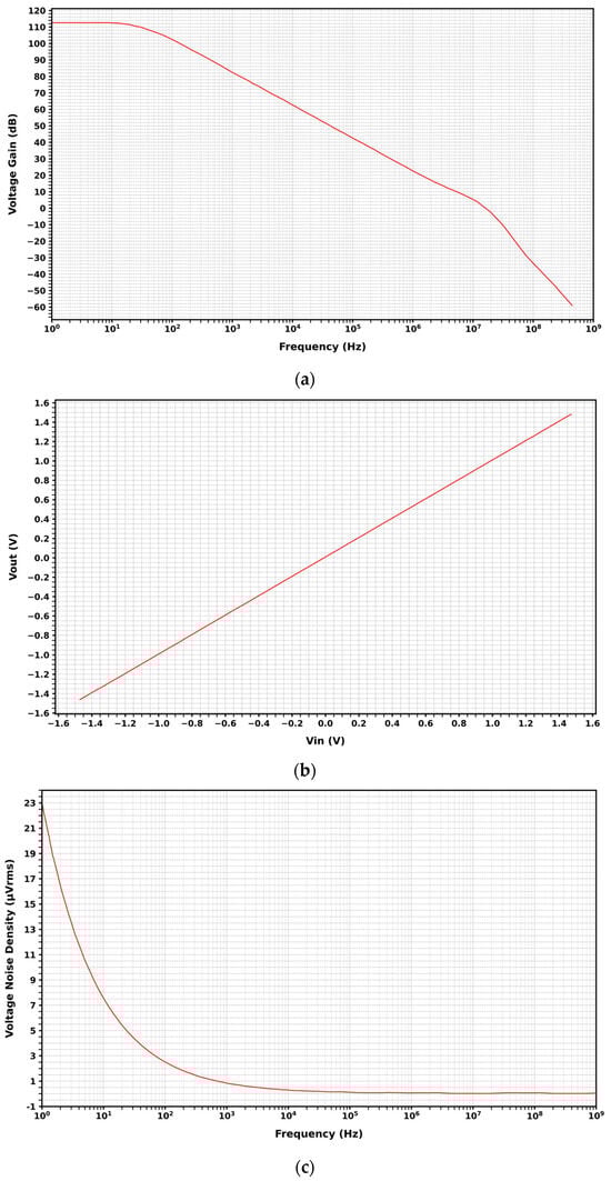 The designed OPAMP achieves an open -loop gain of 110 dB, a unity gain bandwidth of 20 MHz, and a power consumption of 44 µW with a ± 1.65 V power supply. Figure 4a elucidates the frequency response of the OPAMP with a load capacitance of 1 pF. The DC response captured in Figure 4b is conducted in unity gain mode by shorting the inverting terminal with output and sweeping the voltage at the non-inverting terminal from −1.5 V to +1.5 V. It achieves an output swing of −1.5 V to +1.5 V. To measure the noise of the OPAMP, all the AC input voltages are set to ground potential and the Root Mean Square (RMS) noise is measured at the output of OPAMP. Noise performance of the OPAMP is shown in Figure 4c and by integrating the noise over the frequency range of 1 Hz to 20 MHz, the calculated RMS output noise of the OPAMP is 233 µ.