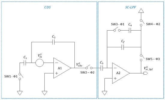 When Φ1 is high, ‘SW1’ transfers the charge stored in to . When Φ2 is high, ‘SW2’ at the output of the first stage samples the data to the input of the SC-LPF. Φ3 samples the data to the output. OPAMP design of ‘A2’ is identical to ‘A1’. The feedback network in SC-LPF is designed with the resistor emulator circuit instead of a passive resistor, which is in parallel with the (filtering capacitor). This design makes the output data and noise discrete. In Figure 5, represents the input voltage noise of the CDS generated by ‘A1’. and are the output noise of the CDS and the overall system, respectively. The transfer function of the first stage () with a—3 dB cutoff frequency ) is given by Equation (11) [36]. This will be passed to the SC-LPF stage with a—3 dB cutoff frequency and the overall transfer function of CDS with SC-LPF () is represented in Equation (12).
