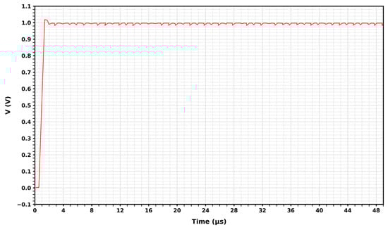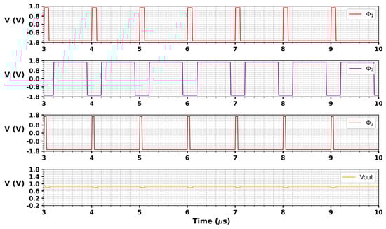 The transient response of the designed CDS with SC-LPF is presented in Figure 8. For the simulation, an input voltage () of 1 V is applied with a sampling frequency of 1 MHz and 5 pF load capacitance, and the output voltage of the CDS with SC-LPF stage () is measured. Three clocks (Φ1, Φ2, and Φ3) are used to simulate the proposed circuit, operating at 1 MHz frequency with a duty cycle ratio of 20%, 70%, and 5%, respectively. These clocks are intended to be supplied externally using a microcontroller.