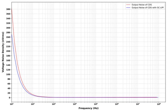 Output noise performance of CDS and CDS with SC-LPF at pre-layout circuit simulation, noise () versus frequency (Hz).