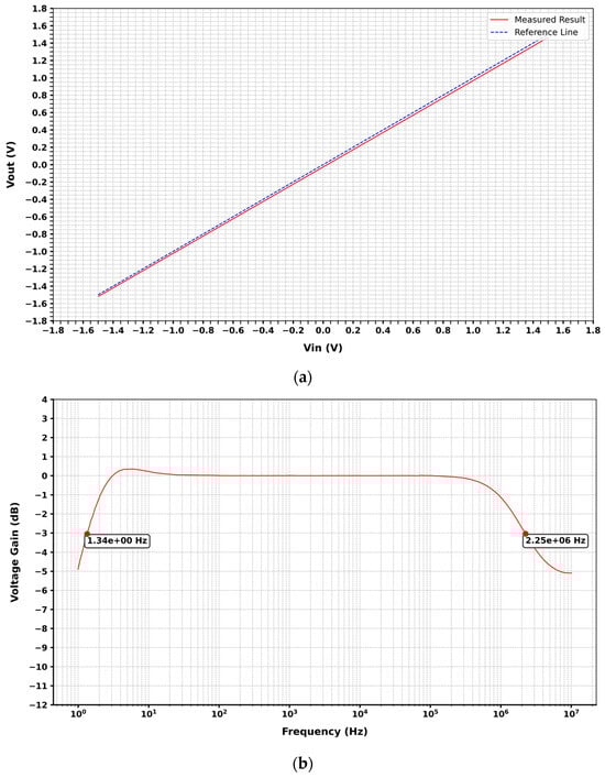 The post-extraction simulation is performed to measure overall DC swing of the proposed CDS with SC-LPF architecture, as captured in Figure 10a, where the X-axis and Y-axis represent and in volts, respectively. In the simulation, is swept in 50 mV steps from −1.5 V to +1.5 V, and the corresponding is measured. Figure 10a shows that the of the CDS with SC-LPF follows ranged from −1.5 V to +1.5 V when a 1 MHz sampling clock and a 5 pF load are used. This demonstrates that the designed potentiometric readout circuit can linearly reproduce the pH sensor response in the range ±1.5 V. The figure further illustrates the deviation of the measured results from the ideal fitting line. Analysis of the linearity curve reveals that the error rate remains below 2.5% for the target DC swing. The overall frequency response of the CDS with SC-LPF system is shown in Figure 10b, which indicates a 3 dB pole frequency at 2.25 MHz. Here, the X-axis and Y-axis represent frequency in Hz and voltage gain in dB, respectively.