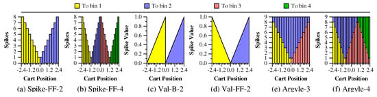 - Argyle-3: With the Argyle spike encoders, each value puts a total of nine spikes into two bins. With Argyle-3, the first and third bins are identical to the first and second bins of Spike-FF-2. The second bin receives spikes such that the total count of spikes for each value is nine. The name “argyle” comes from the spike encoder documentation within the TENNLab software, version 1d2b769 [5,14,15]. Figure 2e illustrates how the cart positions are mapped to bins and spikes with Argyle-3.