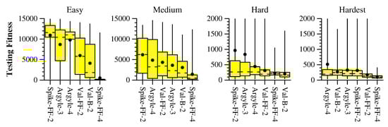A strong conclusion from Figure A4, in comparison with Figure A3, is that the Hardest benchmark is indeed harder than the Hard benchmark, at least when using EONS for training. For example, the average third quartile testing fitness of all of the runs in Figure A3 is 7336 timesteps. For the runs in Figure A4, the average testing fitness is 777 timesteps, a reduction of 89.5%. The training times are much faster, because training time is affected by the fitness.