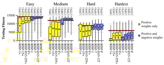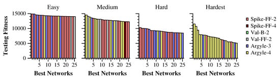 For the remaining parameters, we ran 300 independent runs for each parameter setting. It is clear from Figure A2 that more initial passes (i = 100) leads to more efficient optimizations. However, that improvement comes with a time penalty that is roughly proportional to the fitness improvement. There is no combination of population size, epochs and initial passes that stands out from the data in Figure A2. In the work that follows, we use a population size of 600 for 38 epochs, using 100 initial passes. In our tests, 23.6% of the networks with these hyperparameters exceeded our target fitness of 12,000, albeit with a high third quartile training time of 11.6 min on the Pi5.