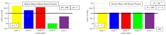 Example of how distributed consensus gossip algorithms can suppress Gaussian noise—left figure: no sensor fusion is applied; right figure: sensor fusion (randomized gossip) is applied.