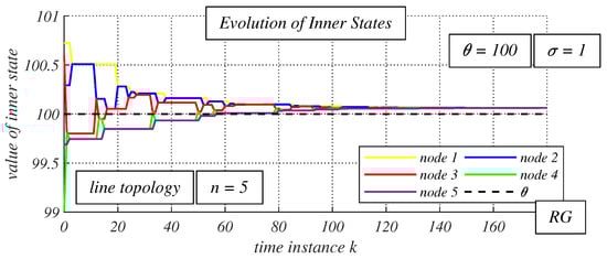 As previously mentioned, the operation of the tested algorithm is bounded by a stopping criterion to optimize execution time. In the experimental section, we apply the stopping criterion defined in (3) based on the comparison between the highest and lowest current inner states (from all nodes) at time instance k [72]: