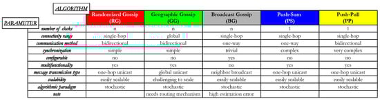 In Figure 5, we present a table outlining the most relevant properties of the examined algorithms to justify their selection. Namely, we provide their number of clocks, connectivity range (meaning whether a node in the WSNs can address its message to only one of its neighbors or an arbitrary node in the network), communication method (meaning whether a message recipient is required to send its message to the message sender (if so, the message of the message recipient is sent at the same iteration)), synchronization, configurability, multifunctionality (meaning whether an algorithm can be applied to estimate other aggregate functions (e.g., the network size)), message transmission types, scalabilities, and algorithmic paradigms.