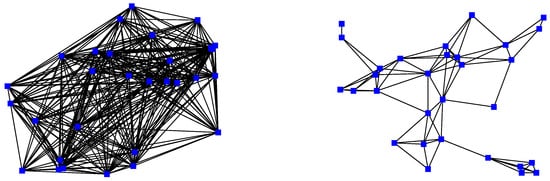 In this paper, we used RGGs, which are a commonly used graph model for representing systems such as WSNs, IoT, social networks, etc. [78,79]. In RGGs, vertices are randomly placed within a finite square area, and an edge connects each pair of vertices if the distance between them is less than a specified transmission radius, which is uniform across all vertices. To produce graphs with various connectivity, we modified the transmission radius.