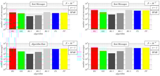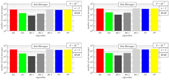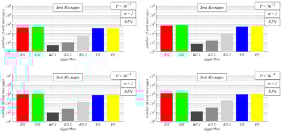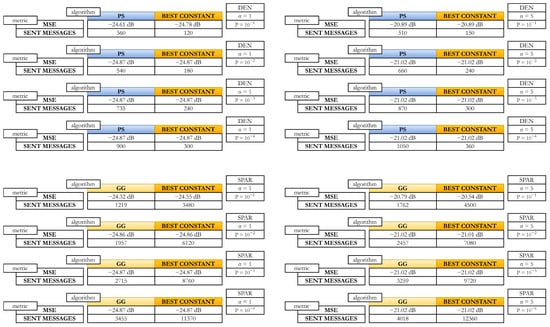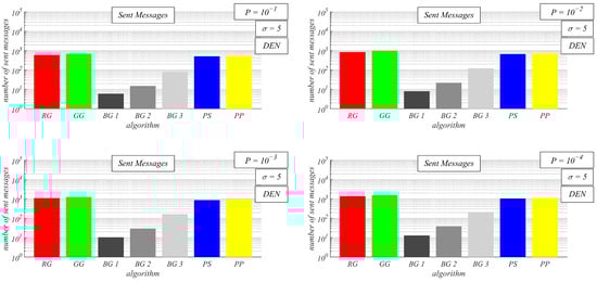 Once the condition (3) is met for the first time, the algorithm is considered complete and ceases execution. The applied stopping criterion is configurable by setting the value of P; higher values are assumed to ensure higher precision of the final inner states, albeit at the cost of slowing down the algorithms [72]. As one can find in [73,74,75], the usage of a stopping criterion is necessary to optimize aspects such as power-energy efficiency, resource management, delivery rate, network lifetime, data precision, computational requirements, etc. Therefore, implementing a stopping criterion is essential for real-world applications. In Figure 3, we show how the MSE and the number of sent messages differ in a random simple topology when the value of P is modified (PS is applied).