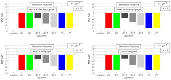 In [68], the application of average consensus algorithms with the Perron matrix to compensate for incorrect data was investigated in several WSN scenarios. Namely, the graph order weights, the maximum degree weights, and the best constant weights were applied to compensate for Gaussian noise skewing the measured data. From the results, it was seen that all algorithms could significantly suppress Gaussian noise, thereby optimizing the MSE in every examined scenario. The best performance was achieved by the best constant weights, but no difference among the examined algorithms was observed for many configurations of the applied stopping criterion.