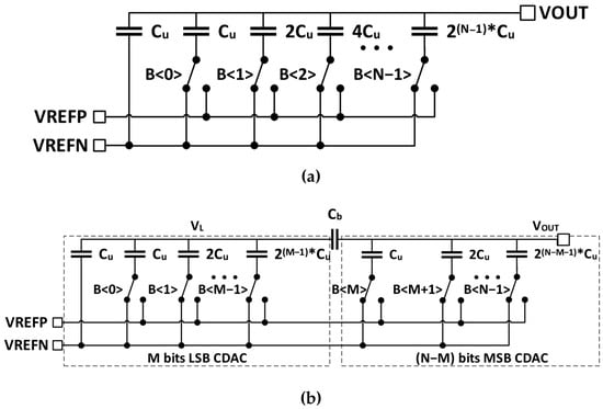 Conventional DAC schematics: (a) binary-weighted CDAC; (b) split CDAC.