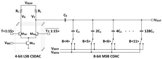 The proposed CSCDAC combines the merits of the low-area CSDAC and the low-power CDAC to form a hybrid structure. In this CSCDAC structure, the CDAC acts as the most significant bits (MSB) sub-DAC, while the CSDAC, separated by a bridge capacitor (), forms the LSB sub-DAC. The structure is similar to a split CDAC but with the LSB CDAC replaced by a CSDAC. Due to the fully differential nature of the CSDAC, only one CSDAC is required to construct a differential CSDAC. Figure 2 illustrates a 12-bit CSCDAC with an 8-4-bit CDAC to CSDAC segmentation. The justification for using this segmentation ratio is provided in the following section.
