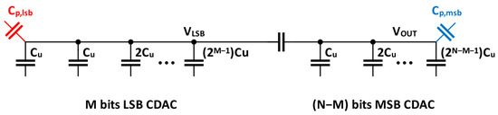 The capacitive digital-to-analog converter (CDAC) in Figure 1a is a standard digital-to-analog converter (DAC) topology well known for its low power consumption and low voltage compatibility. It is essential in a bigger system, such as a successive approximation register (SAR) analog-to-digital converter (ADC) and a radio transceiver. A binary-weighted CDAC contains capacitors and switches that double for every additional bit resolution. To reduce the die area’s cost, split-capacitor architecture was introduced [1]. Figure 1b shows a CDAC utilizing a split capacitor to reduce the die area by resetting the required unit capacitor () in each segmentation. Despite the die area’s advantage, the split capacitor is preferred less often than the conventional binary-weighted CSDAC due to the output code’s dependency induced by parasitic capacitance [2].