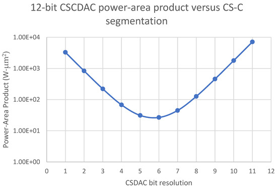 The 12-bit CSCDAC power-area-product versus CS-C segmentation.