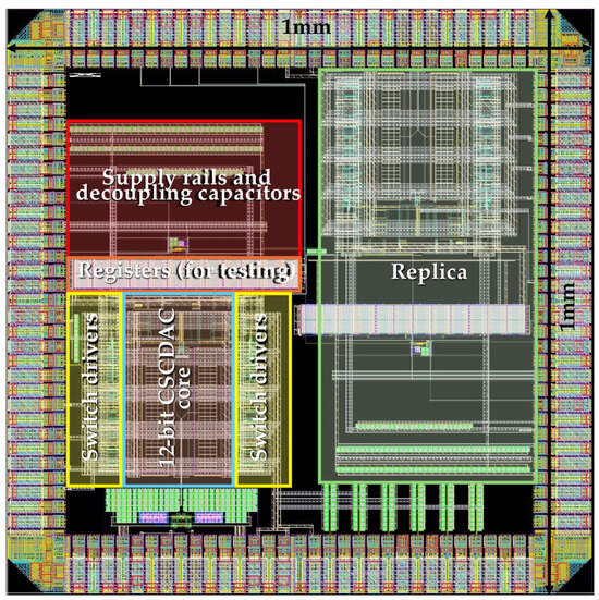 Lastly, the layout of the CSCDAC was carefully drawn. The best efforts were paid to equalize the interconnections between the drivers and the pass transistors. For a compact layout, the pass transistors were placed underneath the unit capacitor that they were connected to. The layout diagram of this work is shown in Figure 7. The total area occupied by the CSDAC core and the switch drivers was 0.154 mm2 (440 μm × 350 μm). The total area would have been 0.227 mm2 if the area of the test circuits was included.