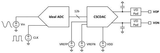 The 12-bit CSCDAC was tested using the test bench shown in Figure 8. The parasitic capacitances of 1 pF were modeled in the test bench. To shorten the simulation time, the test circuits, which comprised a register array, were excluded from this simulation. An ideal 12-bit ADC was used to convert an ideal sine wave with signal frequency to 12-bit words to the CSCDAC. An ideal clock signal was used to set the frequency of the digital words being sampled by the CSCDAC, . and were set to 1 V and 0.5 V, respectively. There were two VDD domains in the CSCDAC block, AVDD, and DVDD, which were both set to 1 V.
