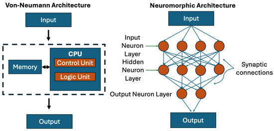 Neuromorphic computing relies on two key principles [11,12,13]: spiking neural networks (SNNs) and synaptic plasticity. SNNs process discrete events, or spikes, instead of continuous signals, enabling asynchronous, event-driven information processing. This mechanism replicates the biological firing of neurons, where a spike occurs only when a threshold potential is reached. In SNNs, an output spike is generated only when the membrane potential exceeds a defined threshold. This event-driven mechanism allows for synchronous processing where consumption occurs only when necessary, reducing energy consumption [14]. As a result, SNNs have much lower idle power consumption compared to traditional artificial neural networks (ANNs). For example, second-generation networks like deep learning networks (DLNs) process real-valued signals continuously, whereas SNNs process binary events, achieving energy savings of up to 20 times in certain cases [15,16]. Synaptic plasticity refers to the dynamic adjustment of synaptic weights based on temporal activity, a key principle to enable adaptive learning in neuromorphic systems. Synaptic weights determine the strength of the connection between neurons, influencing how input spikes affect the receiving neuron’s membrane potential. Artificial implementations utilize materials with tunable resistance and magnetization, particularly those based on Spin-orbit torque (SOT)-magnetoresistive random-access memory (MRAM), allowing energy-efficient weight updates with costs as low as 10 fJ per state change. This offers a significant advantage over charge-based memories in neuromorphic applications [16,17,18]. Weight updates in synaptic plasticity are typically governed by biological learning rules, such as spike-timing-dependent plasticity (STDP). In STDP, the timing relationship between pre-synaptic and post-synaptic spikes determines whether synaptic weights are strengthened or weakened. These temporally sensitive learning rules enable neuromorphic systems to adapt to changing input patterns and support efficient, continuous learning.