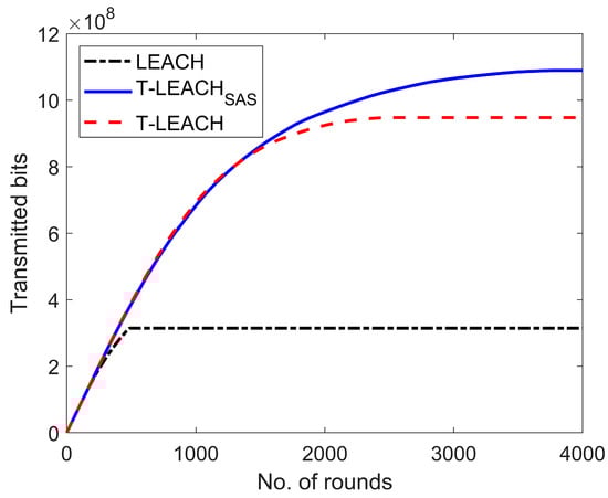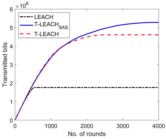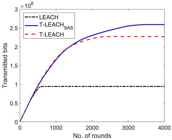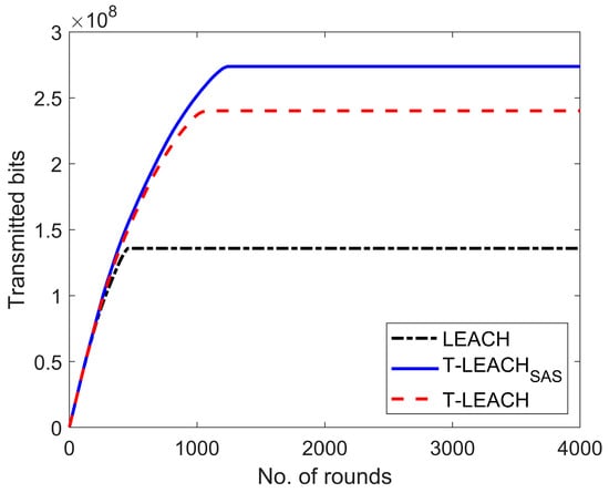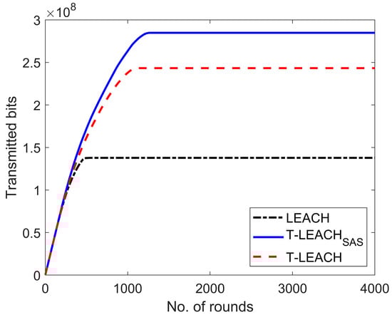 Moreover, it was found that the total volume of data transmitted to the base station by using T-LEACHSAS increased by 175% and 14.1% when compared to that achieved when using LEACH and T-LEACH, respectively. Figure 6 illustrates the total volume of data transmitted per simulation round in the second simulation scenario.