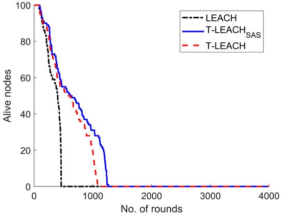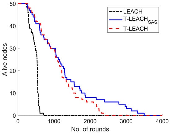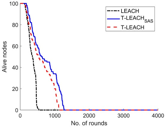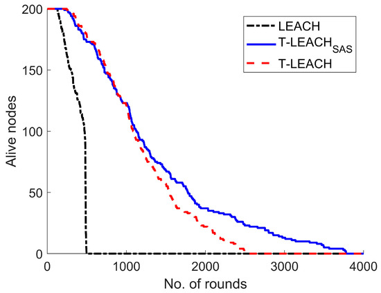 With the intention of appraising the energy efficiency of T-LEACHSAS, its performance was comparatively evaluated against that of T-LEACH and LEACH. Actually, there are certain reasons that justify the selection of the specific protocols to compare their performance with that of T-LEACHSAS. Specifically, LEACH is not only the ancestor of all protocols that perform hierarchical, energy-efficient routing in WSNs, but it also keeps on being the standard of comparison for all new protocols of this kind throughout time [34,35,36,57]. Additionally, T-LEACH, while it keeps on being referred to as achieving higher energy efficiency than LEACH [35,57], is also the protocol that has the most similarities with T-LEACHSAS than any other hierarchical, energy-efficient protocol.