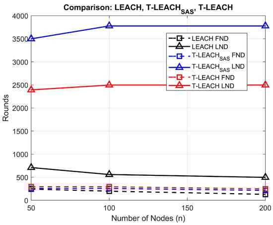 Finally, Figure 13 depicts the influence of the number of network nodes as selected in scenarios 1, 2, and 3 on the performance of the three protocols in comparison, regarding the round that the first node dies (FND) and the round that the last node dies (LND). It is evident that T-LEACHSAS performs well, regardless of the differentiation in both denser and sparser network configurations.