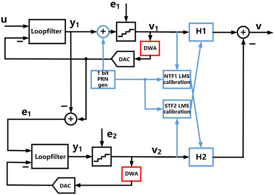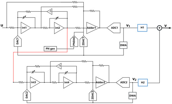 It can be seen that if and , then will be completely eliminated, resulting in (4), which includes the input signal and the quantization noise of the second DSM after being shaped twice. However, high accuracy is required for matching the transfer functions of DNCFs with the transfer functions of an analog loop filter; otherwise, it will cause noise leakage and deteriorate the performance of the ADC.