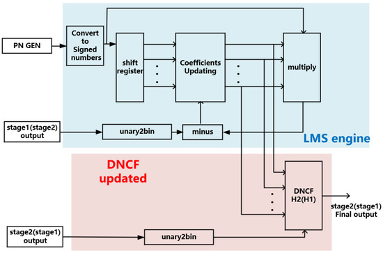The working principle of the STF LMS engine is the same. The coefficients of two DNCFs are updated to eliminate noise leakage. Figure 2 is a schematic diagram of the LMS algorithm, with the blue part representing this structure of the LMS engine and the red part representing the updatable DNCF. For the stability of the calibration algorithm, an 18th-order FIR filter was used as the DNCF in this design rather than an infinite impulse response (IIR) filter.