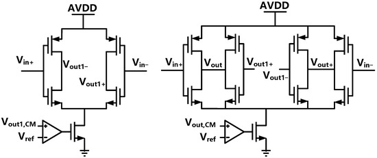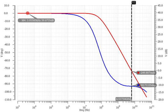 The GHz sampling rate requires a high GBW for the operational amplifiers in the integrator. In order to provide sufficient gain with small channel lengths, a multi-stage operational amplifier is needed. This design uses two-stage operational amplifiers and ensures stability using feedforward compensation, as shown in Figure 4. Compared to Miller compensation, feedforward compensation does not require an additional capacitor load for the second stage, thus saving power consumption with the same bandwidth and phase margin [26]. The complementary input pairs can improve transconductance under a certain current [27]. Taking the first integrator operational amplifier as an example, this structure can achieve a DC gain of 39.7 dB and a UGB of 6.5 GHz with a power consumption of 4.19 mW. The frequency response curve of the first operational amplifier is shown in Figure 5.