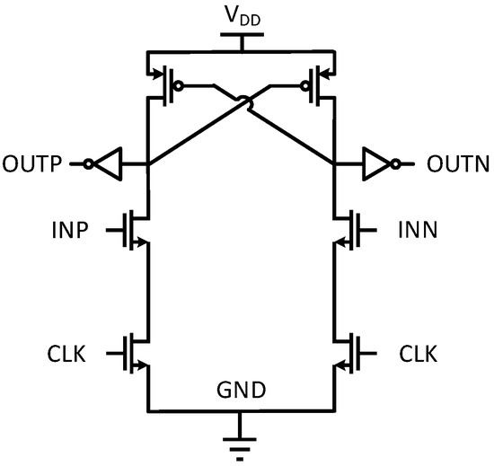 Considering the 1.6 GHz clock frequency and quantization bit count of no more than 4 bits, the quantizer uses a flash ADC for faster speed. The comparator structure is shown in Figure 6 [28]. When the reset signal is 0, the comparator is reset. When the reset signal is 1, the current generated from the input transistor creates a voltage difference across the cross-coupled load transistor.