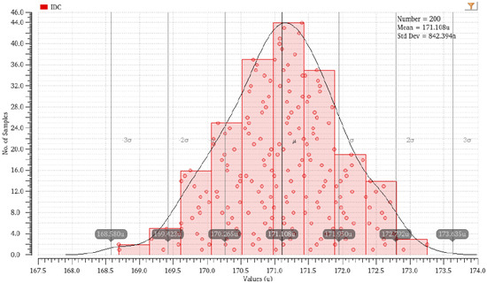 The mismatch current of the current steering DAC cell is simulated 200 times by Monte Carlo, and the simulation results are shown in Figure 10.