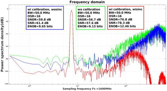 Simulated spectrum with/without calibration at tt process corner, 27 °C.