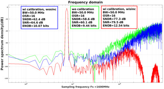 Figure 12 shows the transistor-level simulated PSD of the presented ADC with 4096 sampling points, where transient noise is included. The green spectrum shows the uncalibrated result. It can be seen that because the DNCFs do not match the STF and NTF, noise leakage occurred, resulting in a SNR of only 57.6 dB. The blue spectrum is the calibration result obtained by directly searching the transfer function, and the calibration effect is very poor, resulting in a SNR of only 61.4 dB. From the spectrum perspective, although the characteristic of fourth-order noise shaping is also reflected at high frequencies, it can be seen that there is a tendency for the spectrum to rise within the bandwidth, and noise cancelation is not good. This is because the parasitic pole at the input of the quantizer causes the NTF peaking. This peak will have a serious impact on the convergence process of various coefficients in the LMS engine, requiring more taps and calibration points to complete sufficient convergence. Therefore, it is necessary to use a digital low-pass filter to eliminate NTF peaking before calibration. The final calibration result after filtering using an FIR low-pass filter is shown as the red spectrum in Figure 12, achieving a SNDR of 76.8 dB and a SNR of 78.3 dB.
