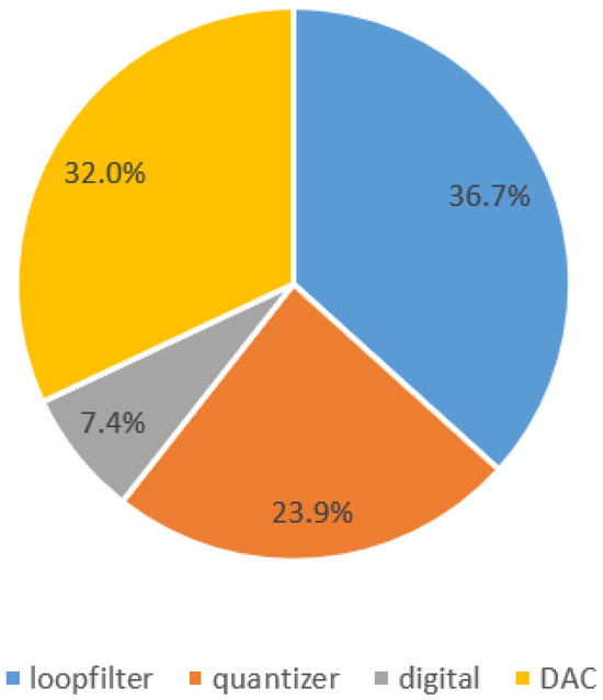 The power consumption of the entire CT 2-2 MASH is 29.7 mW, with DAC and the operational amplifier occupying the main parts because these two components are the main source of thermal noise. A power distribution diagram is shown in Figure 15. The ADC performance is summarized and compared with state-of-the-art designs in Table 3.