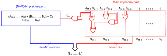General architecture of the proposed approximate adder (NAA). The adder size is N bits. The M-bit imprecise part is shown in red, and the (N–M)-bit precise part is shown in blue.