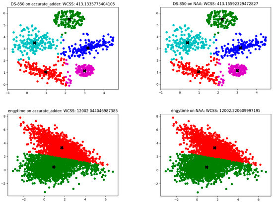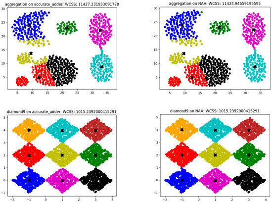 The clustering results obtained using the accurate adder and the proposed approximate adder (NAA) are presented side-by-side in Figure 2. Through trial and error, the optimum sizes for precise and imprecise parts of NAA were found to be 9 bits and 7 bits, respectively, for all four datasets. These sizes were selected to ensure that the WCSS value obtained using NAA either matched or was very close to the WCSS value obtained with the accurate adder. As shown in Figure 2, the WCSS value for the diamond9 dataset remains identical for both the accurate adder and NAA, while the WCSS values for aggregation, diamond9, and engytime datasets exhibit slight differences between the two.