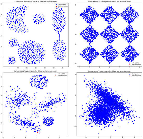 Depicting any differences in data points between clustering performed using the accurate adder and NAA for datasets: aggregation, diamond9, DS850, and engytime. The same data points are highlighted in blue, and different data points are highlighted in red (attributed to NAA).