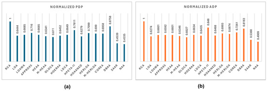 The power-delay product (PDP) is a crucial metric in digital logic design that combines the power dissipation and maximum propagation delay of a circuit. PDP provides insight into the trade-off between the speed performance and energy efficiency of a digital circuit or system. Lower PDP values point to circuits that are faster and dissipate less power, which is essential for optimizing battery life in portable devices. In high-performance systems, reducing PDP can lead to more efficient processing while minimizing heat generation. Designers aim to balance power and speed to meet specific design goals, whether for low-power applications or high-speed computing. Hence, PDP helps in making informed decisions to optimize a circuit’s performance. We calculated the PDP for all the adders mentioned in Table 3 and subsequently normalized these values. Normalization was performed by dividing the actual PDP of each adder by the highest PDP value of a specific adder (in this case, RCA). The resulting normalized PDP values are shown in Figure 4a. A lower PDP is more desirable as both power and delay should be minimized for optimum performance. Thus, the smallest normalized PDP value is preferred, which corresponds to NAA, as seen in Figure 4a.