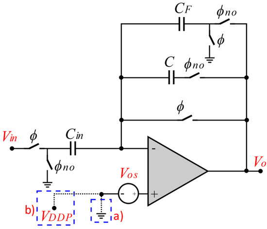 Conventional offset−compensated SC amplifier with a connection to (a) non inverting terminal is connected to a mid-supply voltage for nominal supply operation (shown here as ground potential) or (b) non inverting terminal connected to a voltage VDDP close to one of the rails for low-voltage operation.