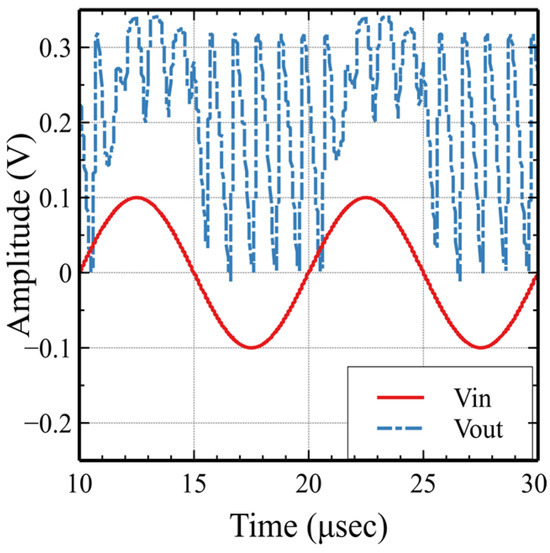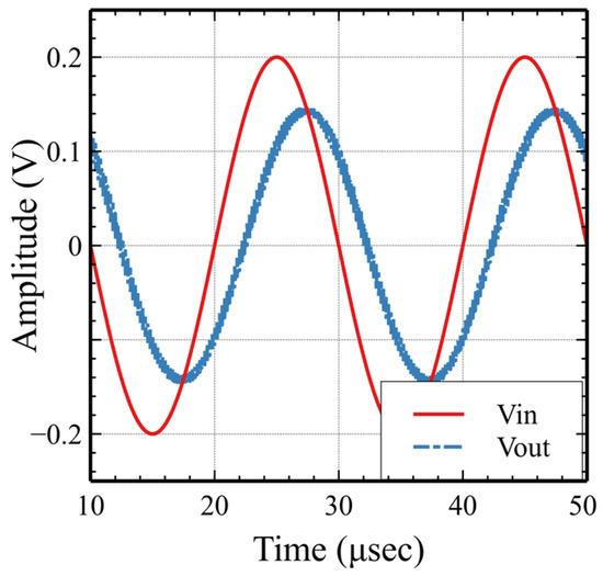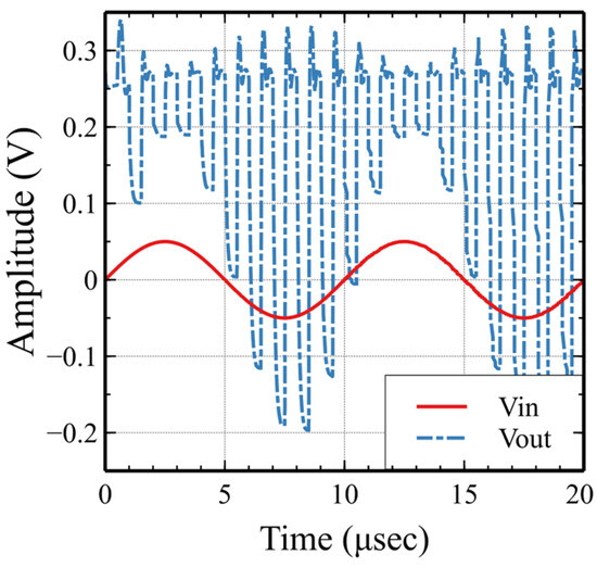 The proposed low-pass filter was designed for a cutoff frequency fcutoff = 50 kHz. The circuit is controlled by a non-overlapping clock generator circuit operating with a clock frequency fclk = 5 MHz. The switched capacitors Cin = Cf = 1 pF perform as resistors, with values Rin = Rf = 200 kΩ. On the other hand, a capacitor C = 15.9 pF, in combination with the equivalent resistance value of Cf, yields to the filter’s cutoff frequency fcutoff = 50 kHz. The frequency response of the circuit that was extracted from transient simulations is depicted in Figure 16. The transient simulation of the low-pass filter with a 50 kHz, 400 mVpp input signal with 30 mV DC offset is depicted in Figure 17 for the proposed circuit and in Figure 18 for the conventional implementation. As opposed to the conventional one, the proposed technique cancels out the 30 mV DC offset and the VDDP voltage at the input. Moreover, the conventional SC filter resets every cycle to the voltage VDDP + Vos.