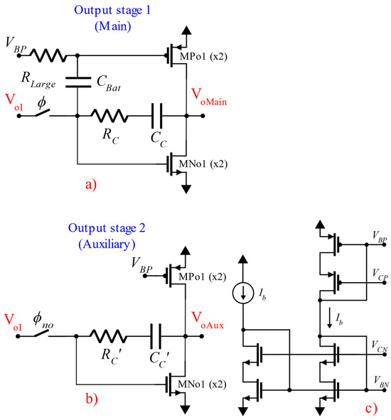The two output stages (main and auxiliary) are shown in Figure 6. Output stage 1 shown in Figure 6a is a free class AB amplifier [21] used as the main (signal path) output of the op-amp. In this stage, free class AB dynamic operation is achieved by means of capacitor Cbat and resistor RLarge. The auxiliary output stage 2 shown in Figure 6b is a class A amplifier, and it is used as the low-power auxiliary output of the op-amp. It operates with a bias current 10 times lower than the main output stage.