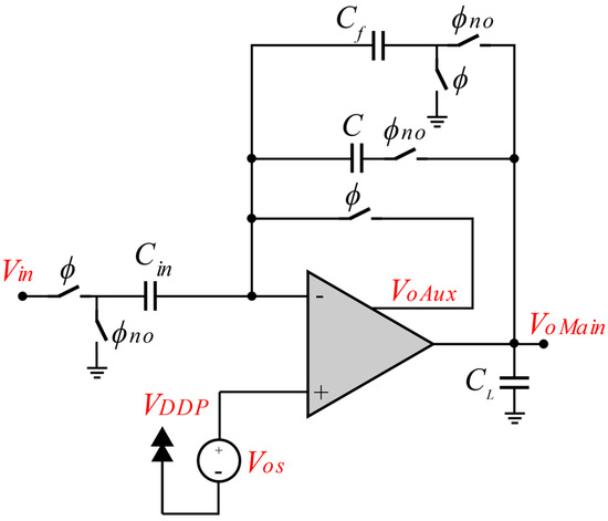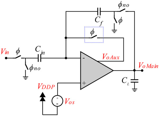 Figure 7 shows the proposed low-voltage implementation of an SC amplifier with offset compensation using the multiple-output op-amp described in the previous section. The gain A in this circuit is determined by capacitors Cf and Cin, as stated in Equation (10). During phase ϕ, the input of the auxiliary amplifier is connected internally to the output terminal of the input stage, and its output (the auxiliary output) is connected externally to the negative input terminal of the op-amp. In this case, the circuit is configured as a voltage follower with respect to VoAux. This forces the auxiliary output to settle to a voltage VoAux = VDDP + Vos. At the same time, Cin and Cf charge to voltages VCin = Vin − (Vos + VDDP) and VCF = Vos + VDDP, respectively. During the following phase ϕno, the auxiliary output is disconnected from VoI, and the main output is connected internally to VoI and externally to Cf The charge stored in Cin is transferred to Cf, so that the main output voltage settles to the amplified version of the sampled input signal, VoMain = −(Cin/Cf)Vin. This voltage is held at the main output by the compensation capacitor CC during the entire clock cycle, even after the main output is disconnected from the input stage during phase ϕ. Therefore, the main output is not reset to zero as in conventional SC circuits. It just changes to the new sampled value every clock cycle at the beginning of phase ϕno. On the other hand, the auxiliary output remains at the constant voltage VoAux = Vos + VDDP throughout the operation of the circuit, and for this reason it is not subject to voltage changes and does not require a high slew rate.
