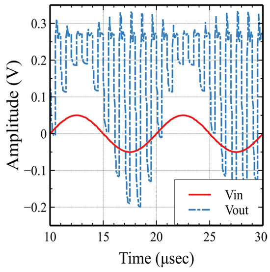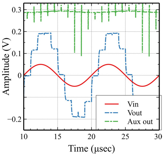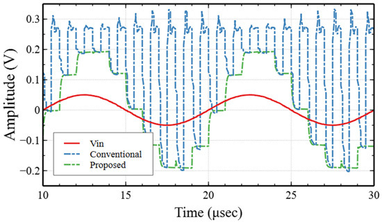 Regarding the large signal figure of merit (FOMLS), the proposed circuit exhibits a higher value than the state-of-the-art work presented in Table 1, except for reference [22]. The FOMLS is important for circuits with high slew rate requirements. The proposed low-voltage switched-capacitor circuits were designed with dual-output op-amps that have true sample and hold outputs. The op-amp does not need to react fast to a long step change, which essentially relaxes the high slew rate requirements. On the contrary, in the case of the conventional sample and hold circuit with a conventional op-amp, the outputs of the op-amps reset to zero (or to another constant value) during one clock phase and excursion from zero to the new sampled value during the other phase. This leads to two significant output voltage variations every clock cycle. Thus, the conventional op-amp needs to have a high slew rate.